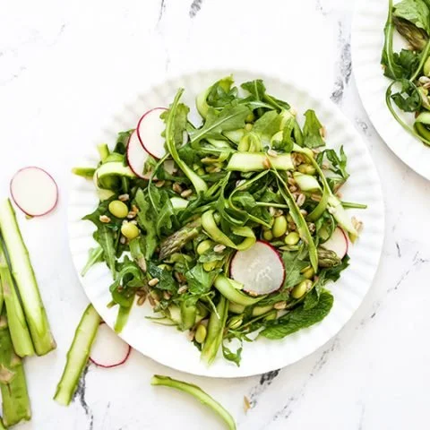 Image 1 of 1 Shaved Asparagus & Arugula Salad With Edamame & Farro $14.00 Farro, edamame, shaved asparagus, radish, scallion. With a light sesame miso dressing. VEGAN. Add To Cart Added! Farro, edamame, shaved asparagus, radish, scallion. With a light sesame miso dressing. VEGAN.